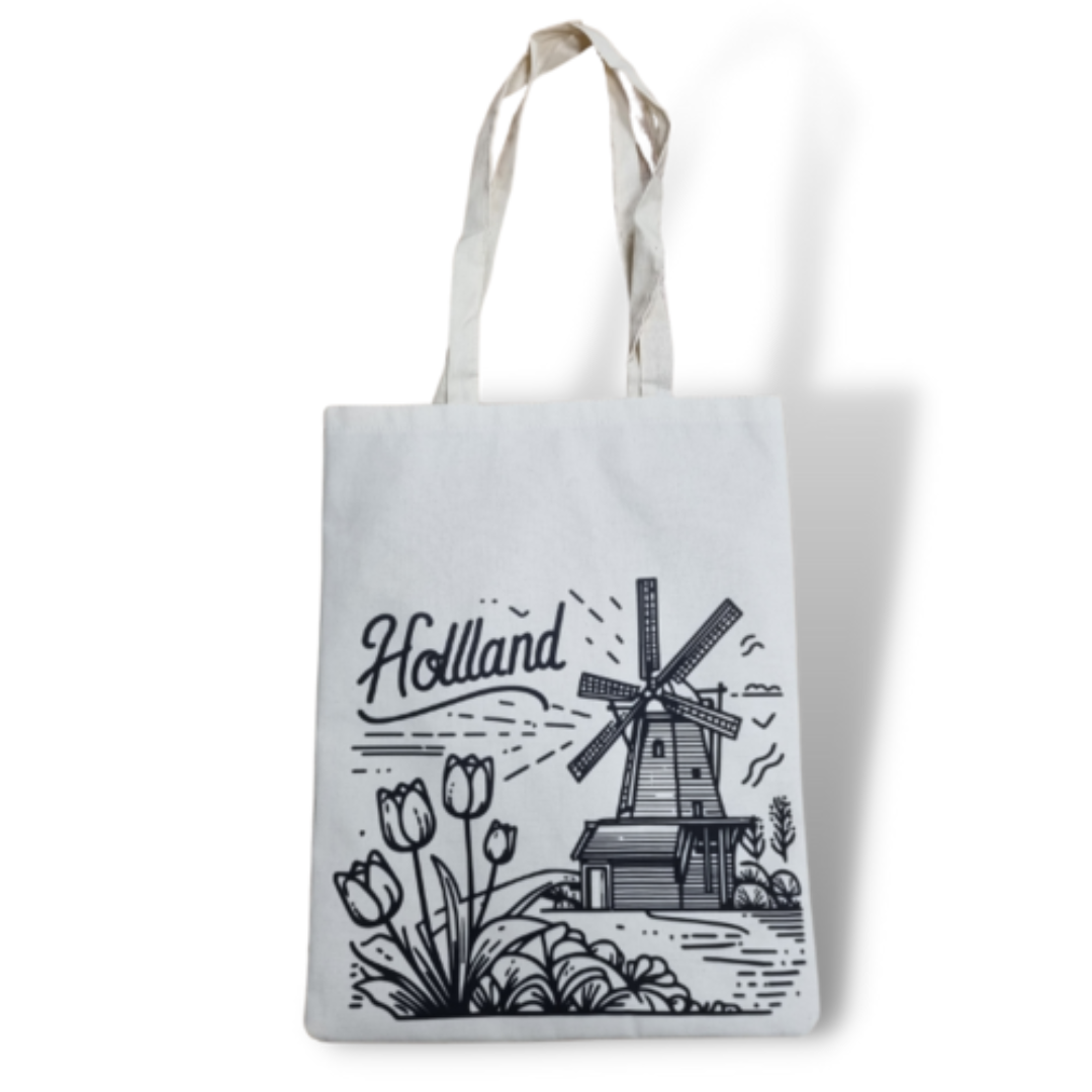 Voeg een vleugje Nederlandse charme toe aan je dagelijkse leven met onze katoenen canvas tas, bedrukt met een prachtig ontwerp van tulpen en molens. Deze full print tas is ideaal voor wie van Hollandse iconen houdt en milieubewust wil winkelen. Zeg vaarwel tegen plastic en kies voor deze duurzame en zijdezachte draagtas. Lichtgewicht en veelzijdig, perfect voor dagelijks gebruik, als origineel cadeau, of om mee te nemen op vakantie. Verkrijgbaar in diverse Hollandse en Utrechtse prints.
