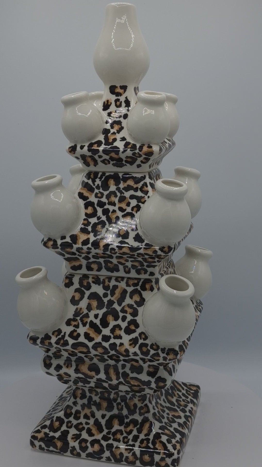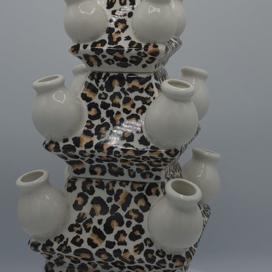 Voeg een vleugje exotische elegantie toe aan je interieur met deze prachtige tulpenvaas met pantermotief.