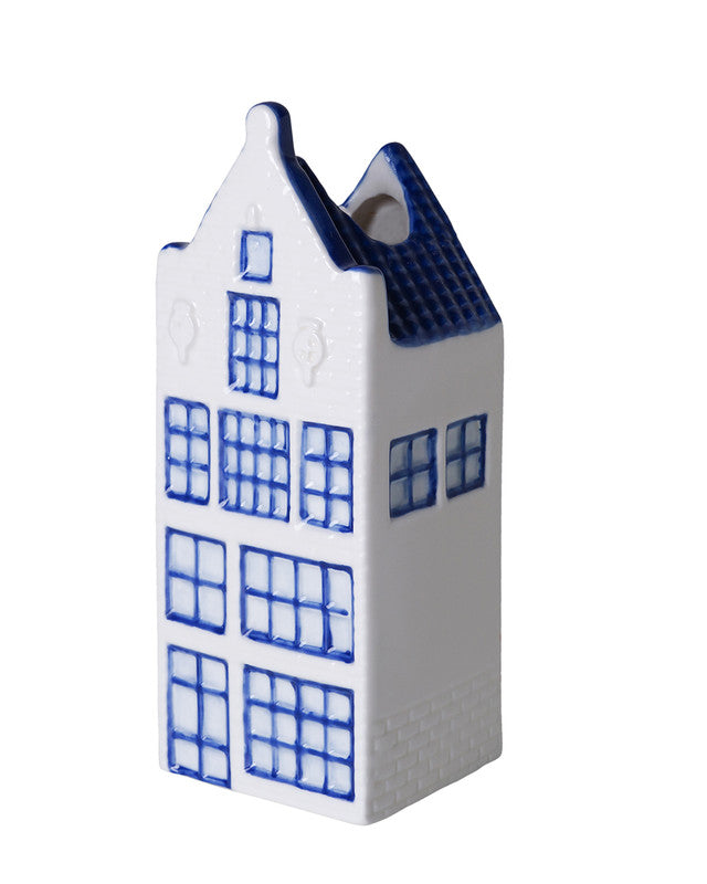 Dit Delfts blauwe vaasje in de vorm van een sfeervol grachtenpandje met klassieke tuitgevel brengt direct een vleugje nostalgische charme in huis. De combinatie van traditionele architectuur met fijne details zoals ramen, een deurtje en baksteenreliëf maakt dit huisje een subtiele blikvanger.